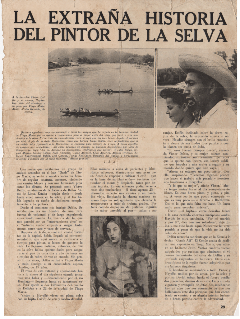Una noche que estábamos un grupo de amigos sentados en el bar “Oasis” de Tingo María, se sentó a nuestra mesa un hombre de regular estatura, moreno, vistiendo una camisa blanca y con una humeante pipa entre los dientes. Se presentó como Víctor Delfín, ex-alumno de la Escuela de Bellas Artes de Lima. Estaba llegando desde —decía— los más recónditos rincones de la selva, y al fin había logrado su sueño de dedicarse completamente a la pintura.