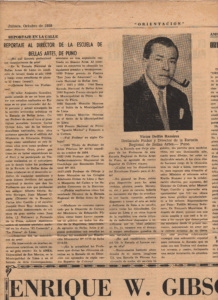 Artículo publicado en Juliaca en octubre de 1959, que recoge una entrevista a Víctor Delfín durante su gestión como Director de la Escuela de Bellas Artes de Puno, abordando su visión educativa y su compromiso con el desarrollo artístico en la región.
