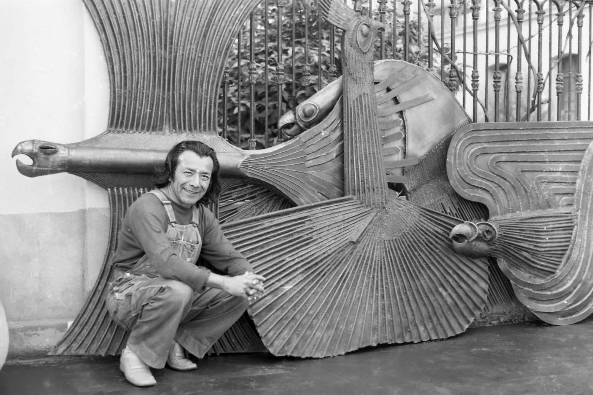 El artista con algunas de las esculturas parte de su serie “Aves de América” (circa 1970). Archivo Casa Taller Delfín.
